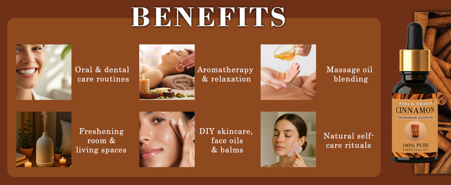 PANCH SHAKTI® Cinnamon Bark Essential Oil is a 100% pure and natural oil with a warm, spicy aroma. Known for its antioxidant and antibacterial properties, it helps rejuvenate the skin, nourish the scalp, and provide a soothing experience for massages and aromatherapy.