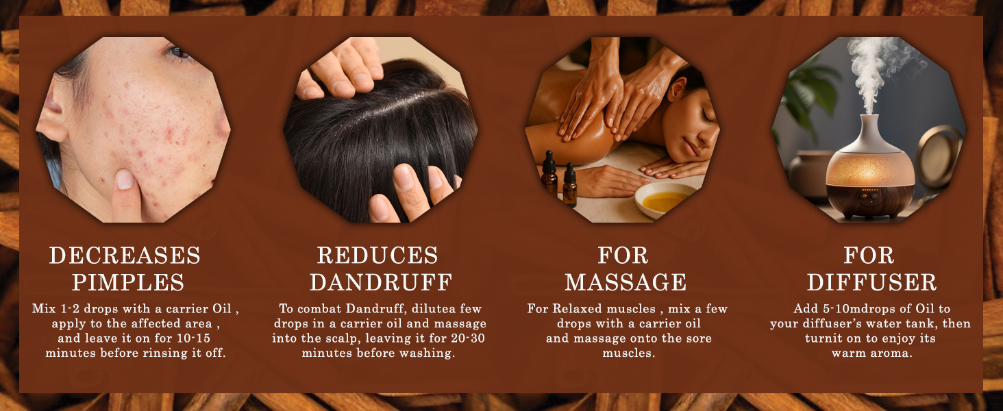 PANCH SHAKTI® Cinnamon Bark Essential Oil is a high-quality, steam-distilled oil derived from pure cinnamon bark, ensuring its rich and potent benefits. This essential oil is packed with antioxidants and antibacterial properties, making it a powerful addition to skincare and haircare routines. It helps reduce the appearance of scars and blemishes, soothes irritated skin, and promotes a clear, youthful complexion. For hair, it nourishes the scalp, helps reduce dandruff, and encourages healthy hair growth. Its warming and comforting scent makes it an excellent choice for aromatherapy, promoting relaxation and a sense of well-being. When used for massages, it helps relieve muscle tension and provides a deeply calming experience. Free from sulphates, parabens, and harmful additives, this cruelty-free essential oil ensures a pure and natural wellness experience.