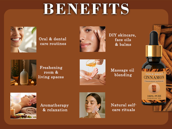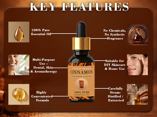PANCH SHAKTI® Cinnamon Bark Essential Oil is a 100% pure and natural oil with a warm, spicy aroma. Known for its antioxidant and antibacterial properties, it helps rejuvenate the skin, nourish the scalp, and provide a soothing experience for massages and aromatherapy.