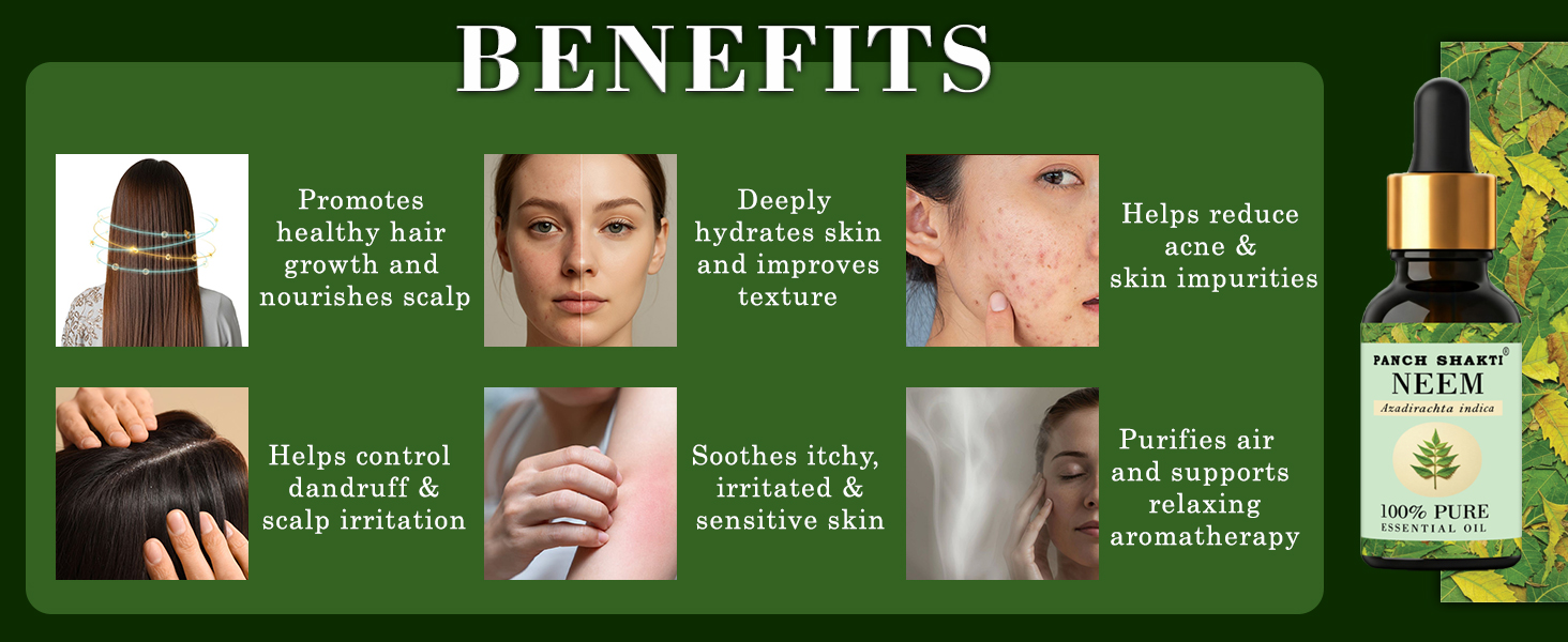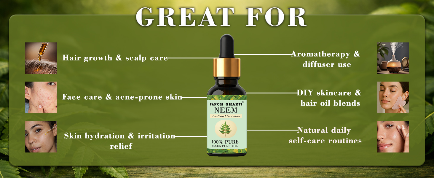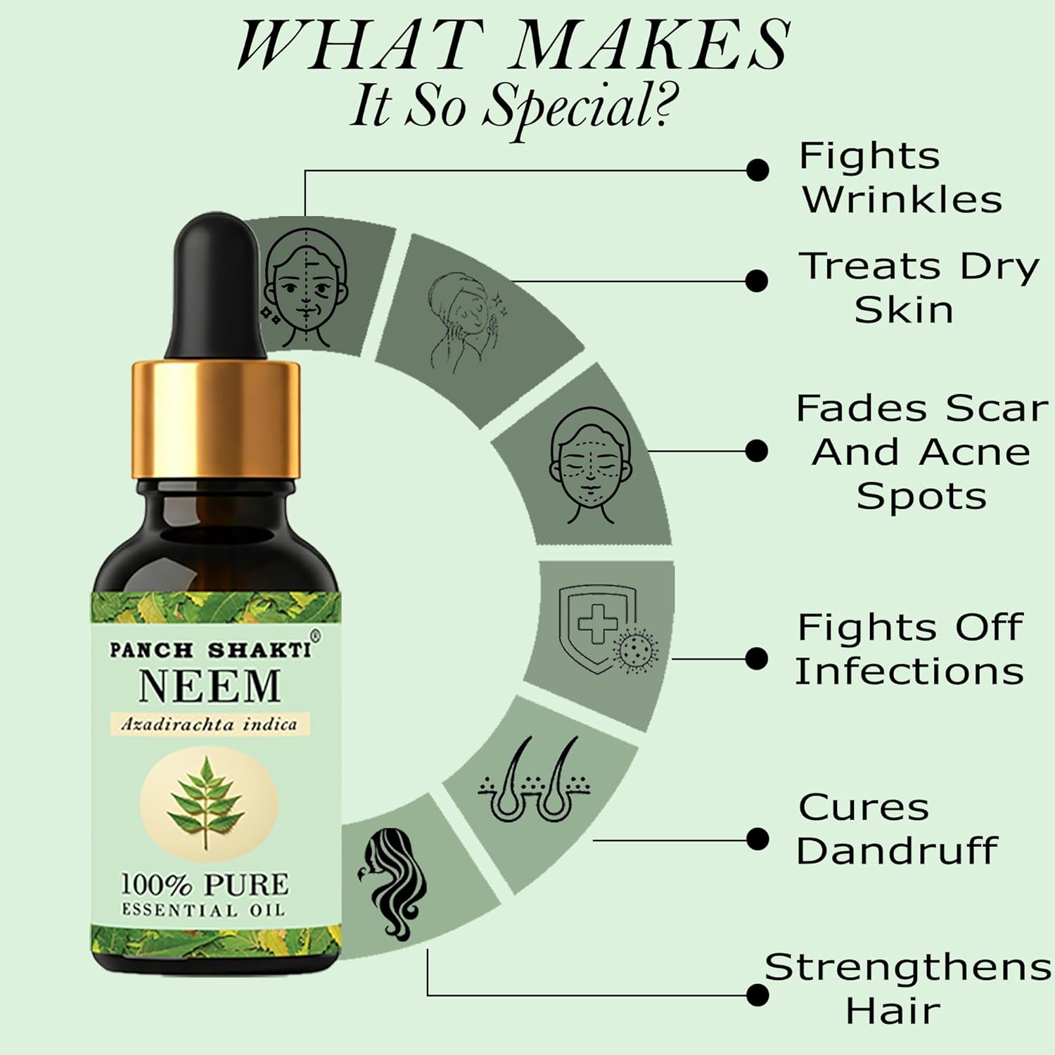 Panch Shakti Neem Essential Oil (Organic) is a 100% pure and natural solution for skin, hair, and overall wellness. Known for its antibacterial and antifungal properties, it helps combat acne, nourish the scalp, and promote healthy skin. Ideal for skincare, haircare, and aromatherapy, this multipurpose oil is free from chemicals, sulphates, and parabens.